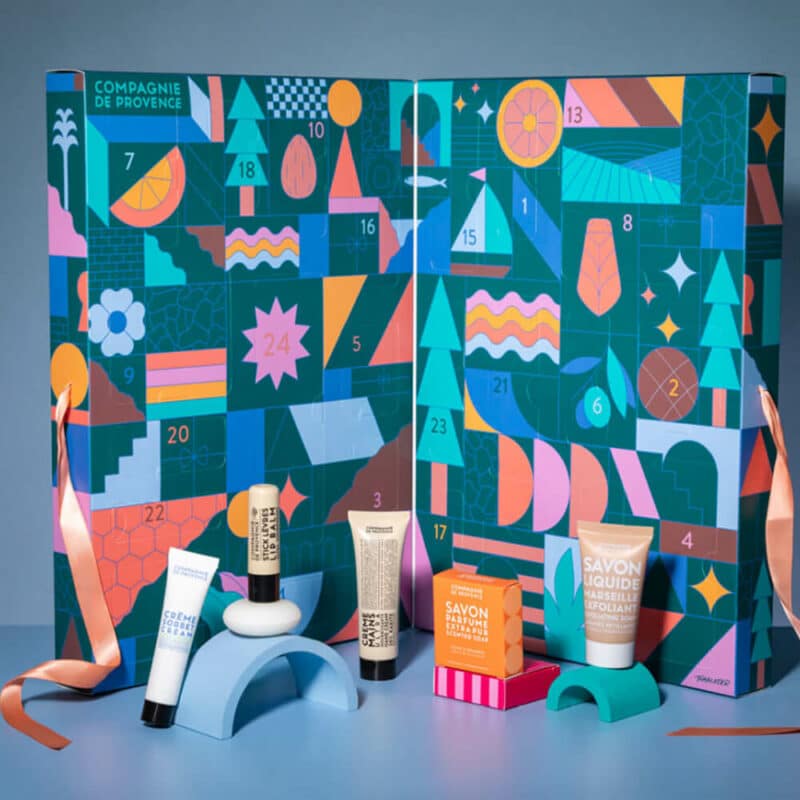 Une édition unique au design géométrique semi-abstrait et coloré réalisé avec talent par l’artiste Tomalater. Un coffret qui respire la générosité, la créativité et surtout le bien-être. Parfait pour mettre en avant les 24 soins parfumés cachés dans ce calendrier de l’avent Compagnie de Provence 2025.